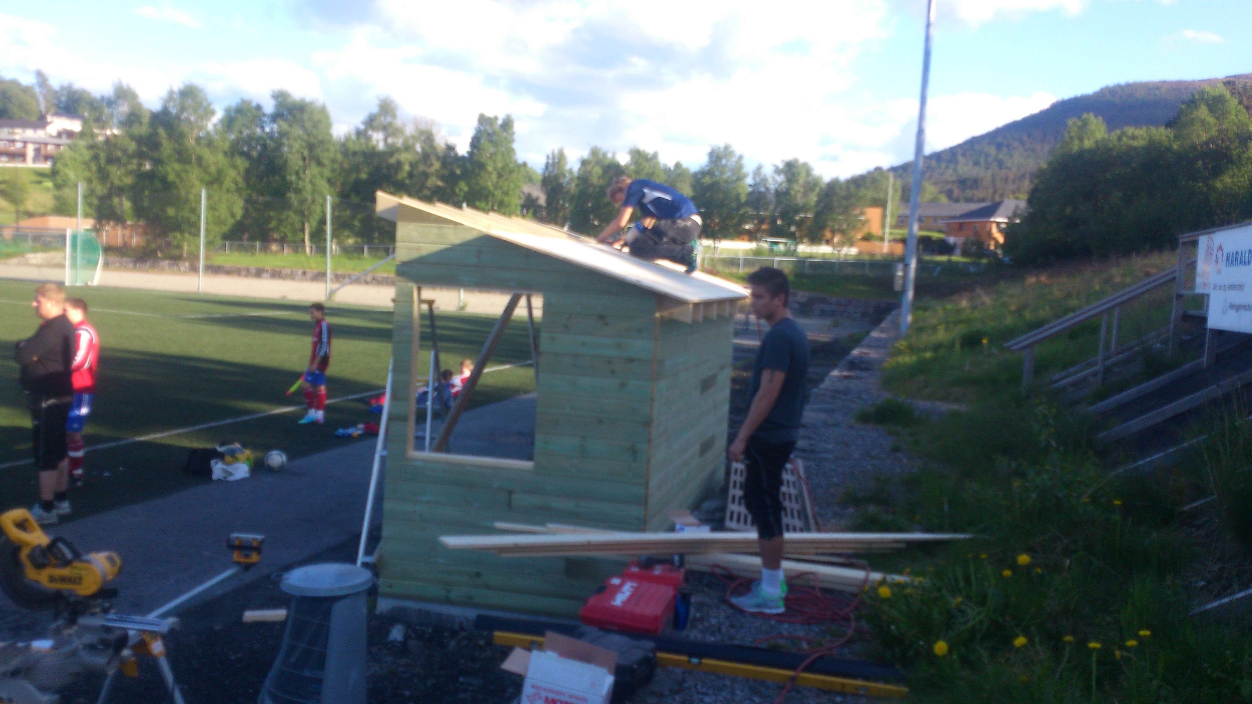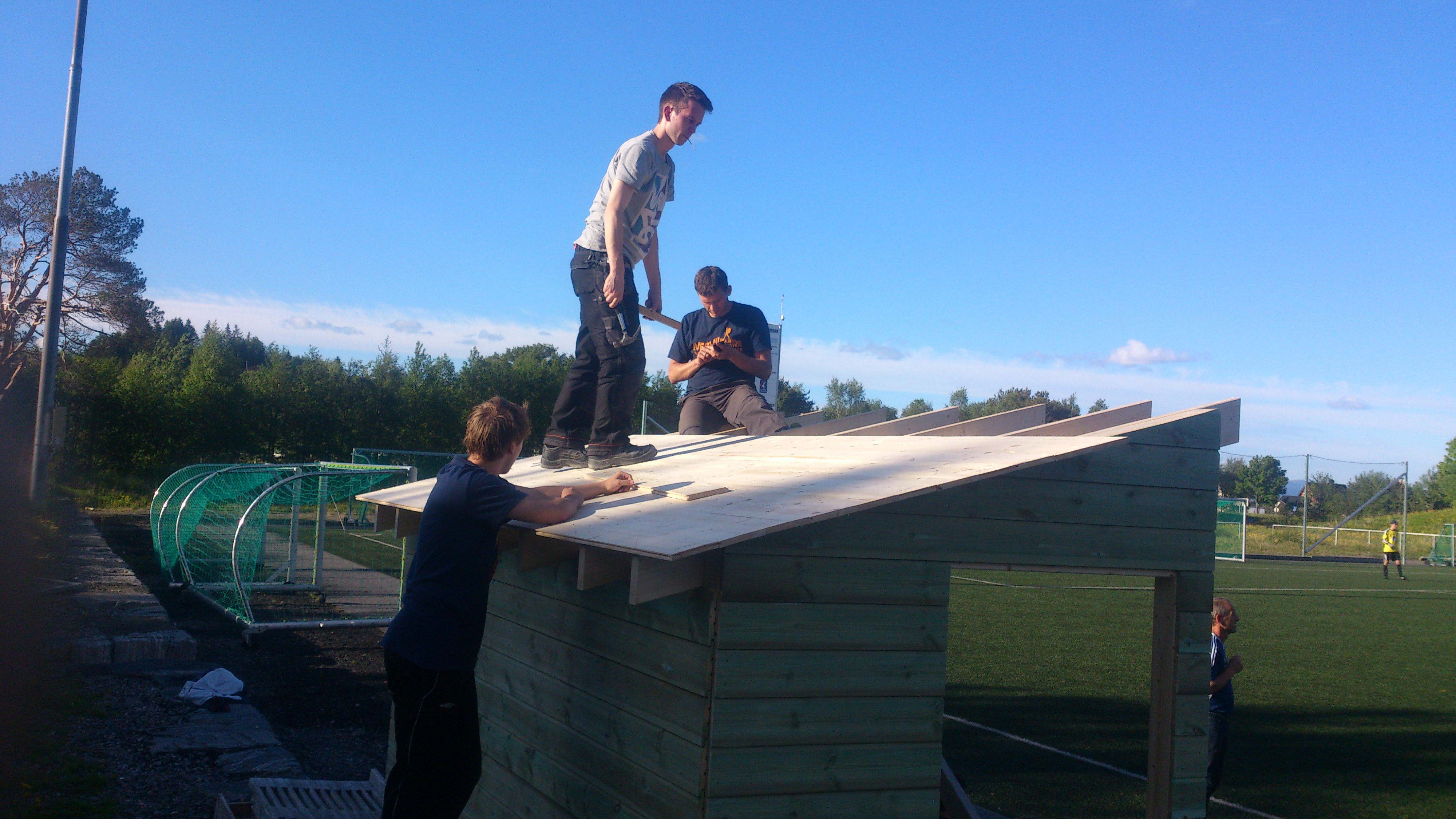 Etter at innbyttarbenkane i Vestnes idrettspark vart øydelagt av hærverk, har det vore dårleg med ly for innbyttarar, trenarar og lagleiarar. Men no skal det bli ordning. Det har A-laget sytt for. Dei har snikra nye overbygde benkar på dugnad. Dermed skulle det igjen bli leveleg å hamne på banken også i Vestnes idrettspark. Foto: Karl Ivar Skare