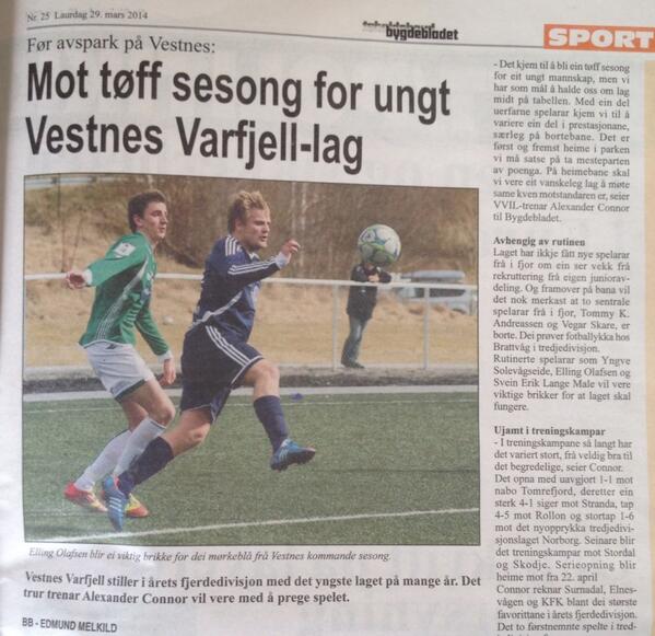 Avisa Bygdebladet har snakka med Alexander Connor om utsiktene for årets sesong, og Vestnes Varfjell-trenaren trur det blir ein tøff sesong med eit svært ungt mannskap. - Vi har som mål å halde oss om lag midt på tabellen. Med ein del uerfarne spelarar kjem vi til å variere ein del i prestasjonane, særleg på bortebane, seier han, og legg til at han haar tru på god poengfangst heime i Parken. Laget har mista Vegar Skare og Tommy Kanishi Andreassen og har ikkje fått inn nokon nye med unntak av opptak frå eigen juniorstall.