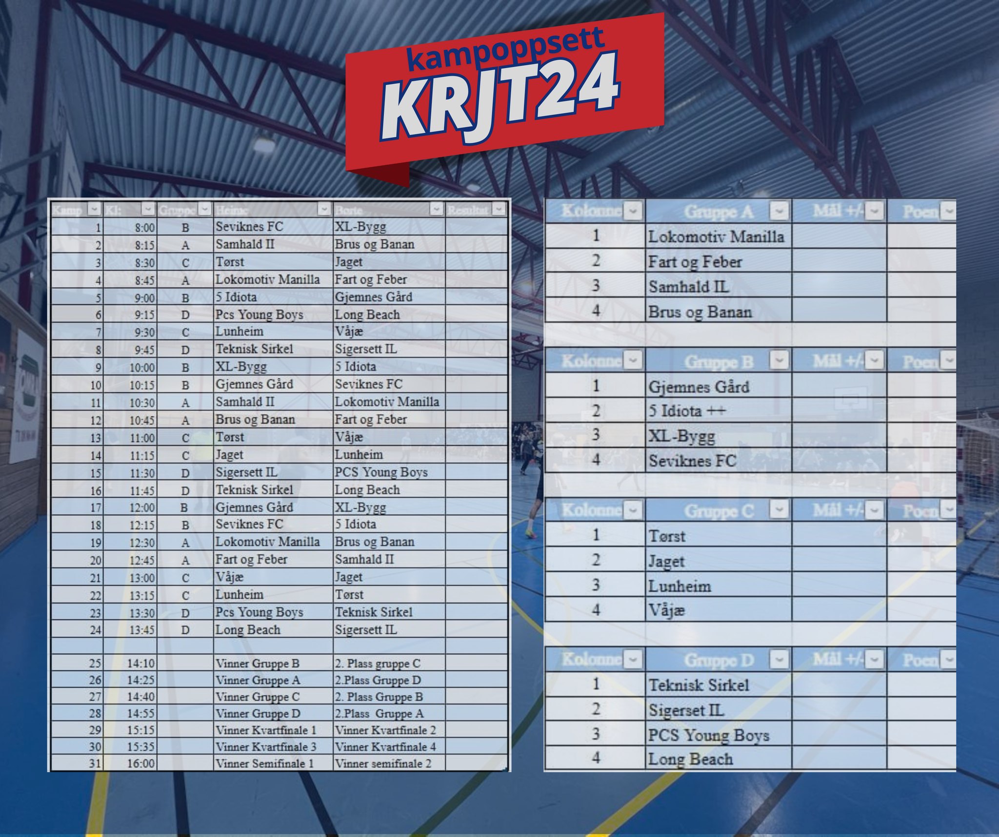 Påmeldingsfristen er knapt ute før arrangøren kan melde at årets utgave av Kjetil Rekdals Juleturnering 2. juledag er fulltegnet. Samtlige 16 plasser er nå besatt, og interessen rundt turneringen fortsetter å øke år for år. Her er kampoppsettet: