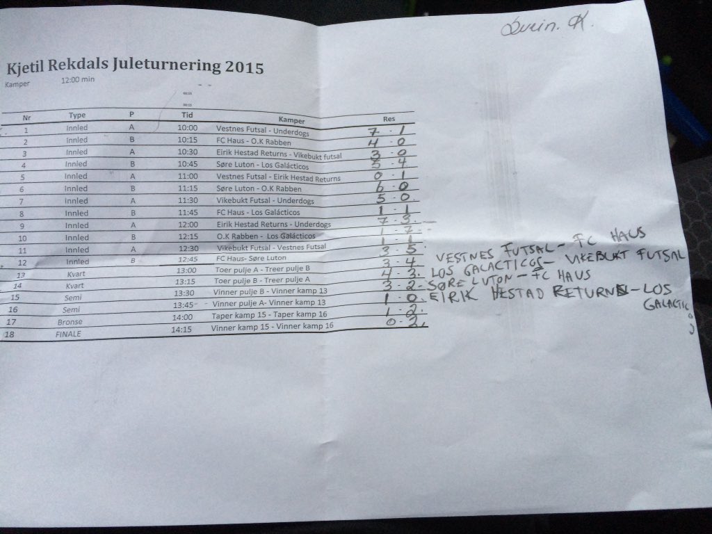 Eirik Hestad Returns gjekk til topps i den 28. utgåva av Kjetil Rekdals Juleturnering i Vestneshallen andre juledag. Laget med MFK-stjerna i spissen slo Søre Luten frå Midsund 2-0 i finalen. Med på laget var også MFK-spiss og årets talent i norsk fotball, Sander Svendsen og Marseille-proff Eirik Haugan. De andre på vinnerlaget var Sivert Viken Beinset, Eskild Rønningen, Andreas Hollingen og fiksdalingen Simon Tomren. Los Galacticos slo FC Haus 2-1 i bronsefinalen. Heimefavorittane frå Vestnes futsal rauk ut i kvartfinalen. - Det var mye bra motstand å bryne seg på i år. Samtidig som innendørslaget jeg spiller på har blitt bedre i futsal, har også motstanderne blitt bedre, men det var sabla gøy å vinne her i dag,sa Sander Svendsen til Romsdals Budstikke etter at pokalen var sikra. BILDEGALLERI | VIDEOAR KJEM HER. Foto: Asbjørn Vik. Alle resultat under: